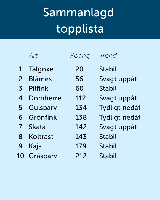 Den sammanlagda listan bygger på varje arts placering under vart och ett av de 20 åren, där en bättre placering ger lägre poäng. Talgoxens obrutna förstaplats ger därför lägsta möjliga totalpoäng.